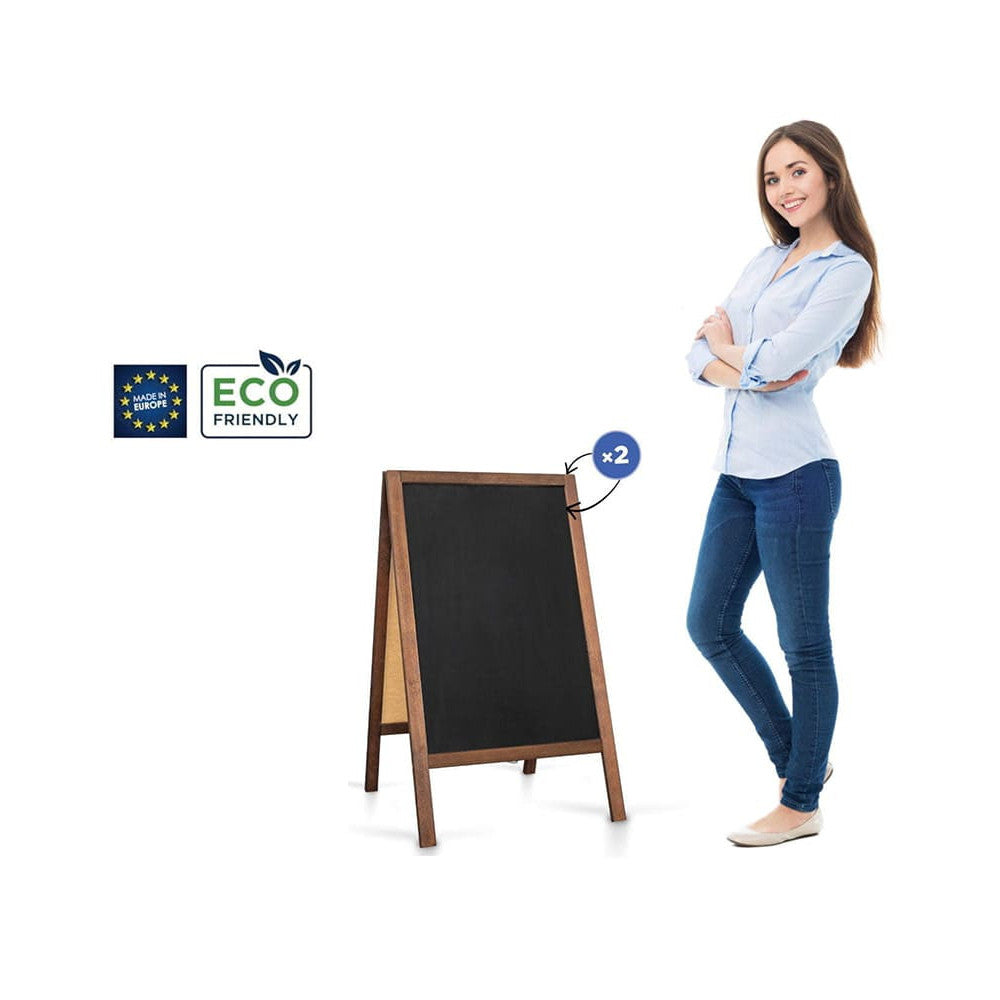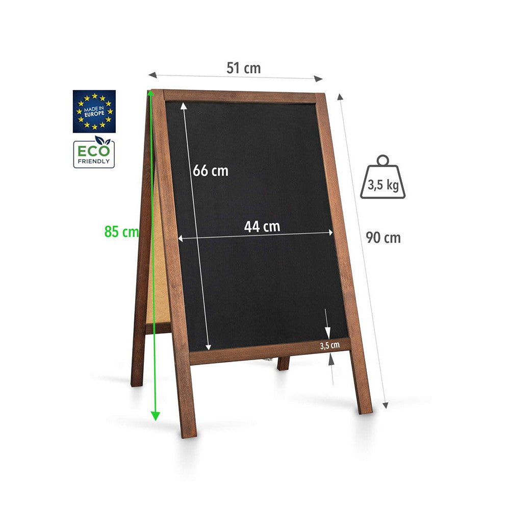 Ideal für alle, die wenig Platz haben, aber trotzdem präsent sein wollen – diese kompakte Kreidetafel mit dunkelbraunem Holzrahmen (Kiefernholz) und A‑Board-Design punktet mit Charakter. Mit beidseitiger Schreibfläche (44 × 66 cm), praktisch leicht (ca. 3,5 kg) und mobil einsetzbar – ob im Café, Shop oder zuhause.