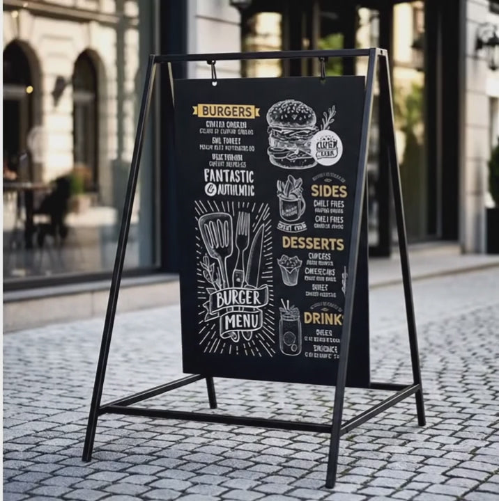 Die Gehwegkreidetafel „Swing Display“ ist ein stilvoller, robuster und funktionaler Tafelaufsteller im Industrial Design. Sie verbindet modernes Erscheinungsbild mit Alltagstauglichkeit – ideal für alle, die ihre Werbung oder Information elegant und wetterfest präsentieren möchten.