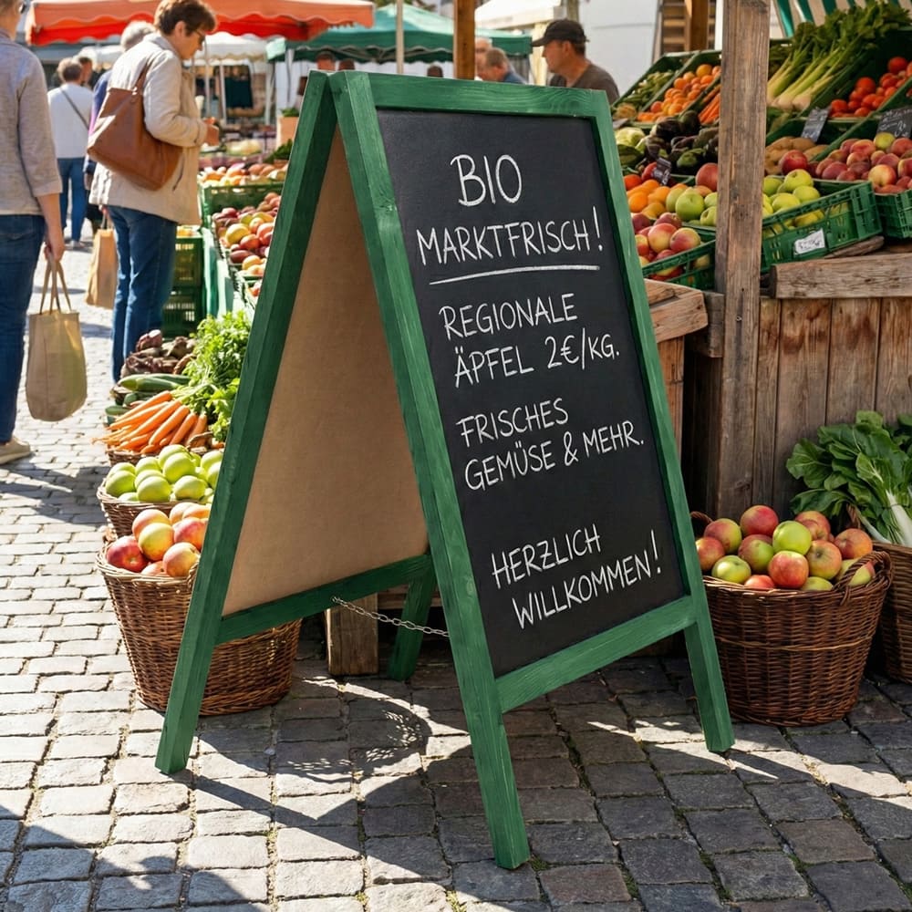 Die Gehwegkreidetafel 90 × 51 cm mit grünem Holzrahmen steht für Frische, Natürlichkeit und klassische Bistro-Optik. Der grüne Rahmen wirkt einladend und authentisch – ideal für Cafés, Restaurants, Bäckereien, Hofläden oder kleine Shops, die eine traditionelle und zugleich auffällige Präsentation bevorzugen.