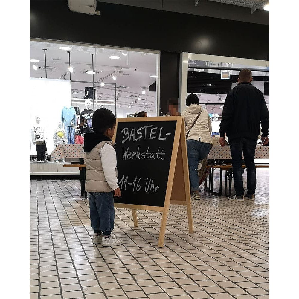Diese Kreidetafel bringt mit ihrem hellen, naturbelassenen Holzrahmen eine warme, freundliche Optik in jeden Raum. Mit einer beschriftbaren Fläche von 53 × 66 cm pro Seite eignet sich der Aufsteller perfekt für den Innenbereich, geschützte Eingänge oder Verkaufsflächen.
