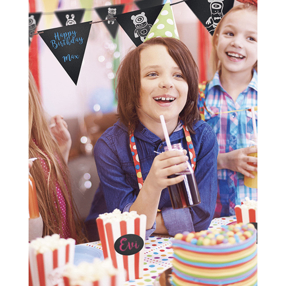 Wimpelkette Kreidetafel 12x zum Präsentieren von Preisen, Angeboten oder für grosse Feste und Kindergeburtstage. Mit dieser Wimpelketten Kreidetafel profitieren Bars von der grossen Anwendungsmöglichkeit. Beschriften Sie jede Flaggentafel mit einem anderen Produkt, z.B. Kaffee, Cappuccino, Latte Macchiato, Espresso, und vieles mehr. Mit der 4m langen, mitgelieferten Schnur können Sie die beschrifteten Kreidetafelflaggen verbinden und beispielsweise beim Eingang oder bei der Kasse aufhängen. Zuhause kann die Wimpelkette als Dekoration an Kindergeburtstagen verwendet werden. Für die Beschriftung empfehlen wir Kreidemarker, welche Sie hier mitbestellen können.