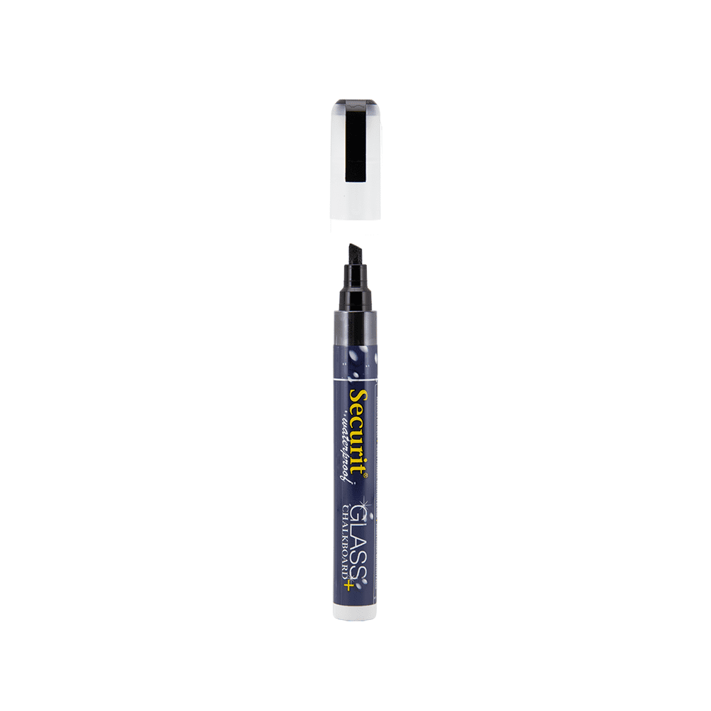 Kreidemarker wasserfest schwarz von der Marke Securit® günstig online kaufen. Ob für Kreidetafeln, Kundenstopper, Glas und alle nicht porösen Oberflächen - Dieser wasserfeste Kreidestift kann vielfältig eingesetzt werden und ist ein echter Allrounder in Sachen Schaufenster Beschriftung im Outdoor Bereich auf Einkaufspassagen. Von Angeboten und Preislisten bis zu verschiedensten Silhouetten wie Kaffeetassen, Sandwiches, Cocktails, Backwaren und vieles mehr. Je nach Haltung des Kreidestifts können Strichbreiten von 2-6mm erzielt werden. Passende Kreidetafeln, z.B. Glas Kreidetafeln können Sie hier bequem dazu bestellen.Eigenschaften & Details