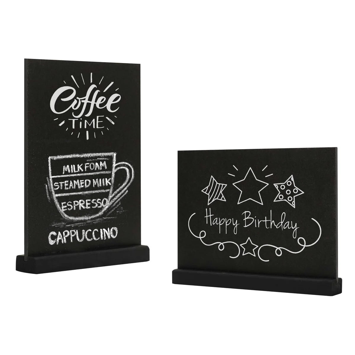 Vielseitig, modern und praktisch: Diese Tischaufsteller-Kreidetafeln mit schwarzem Holzsockel sind die ideale Lösung für alle, die Inhalte elegant und klar präsentieren möchten. Ob im Restaurant, Café, Hotel oder bei Events – diese Tischtafeln setzen Angebote, Preise oder Hinweise stilvoll in Szene.