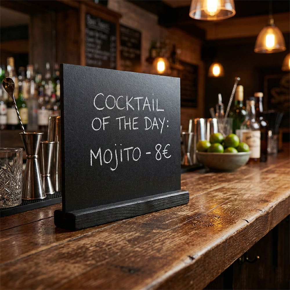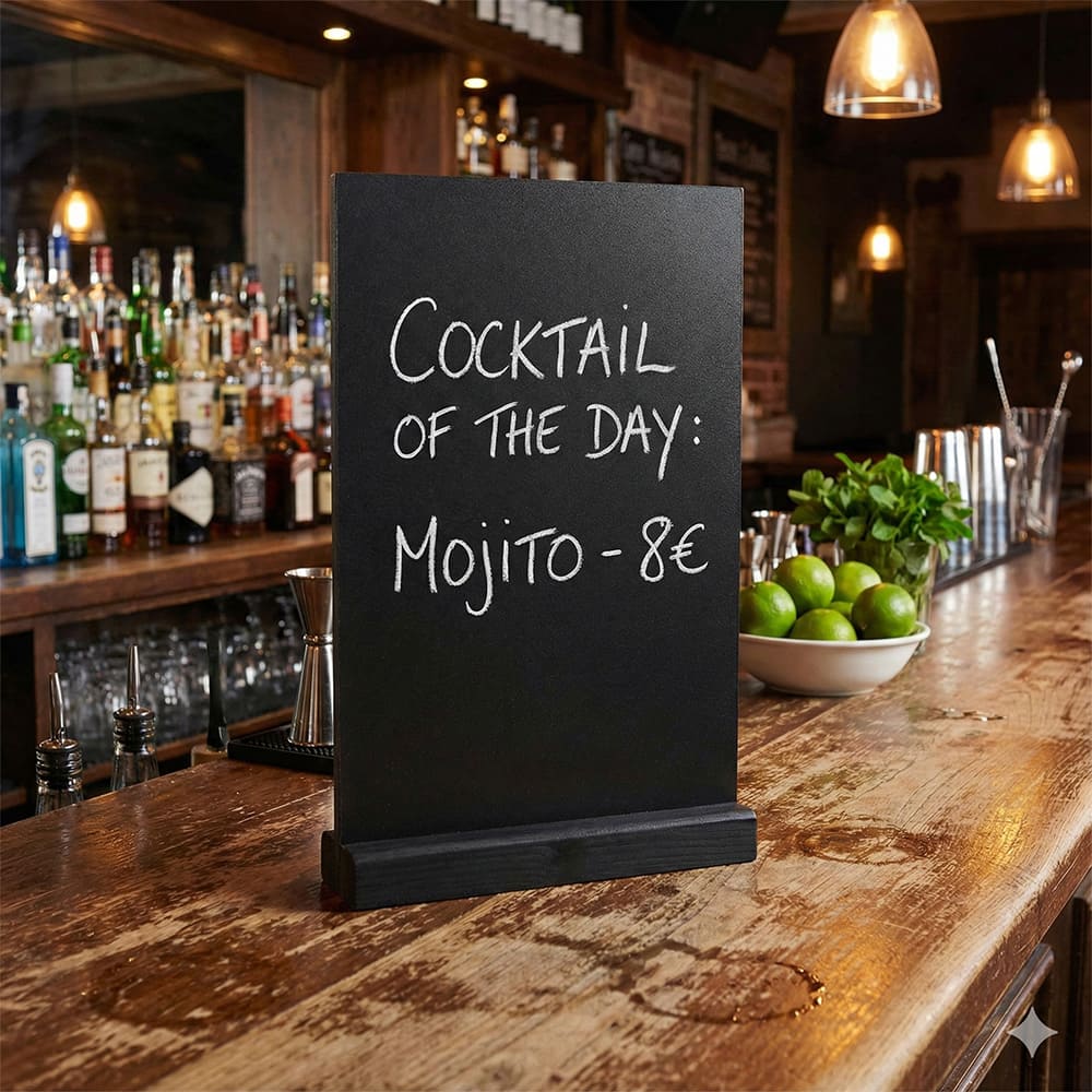 Diese Tischkreidetafeln sind mehr als nur Werbeträger – sie stehen für Qualität, Ordnung und Stil. Ob auf dem Restauranttisch, an der Theke oder im Schaufenster: Sie sorgen für einen aufgeräumten, professionellen Eindruck und unterstützen eine hochwertige Kundenkommunikation.